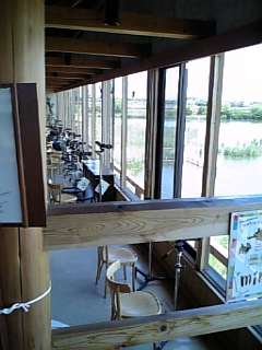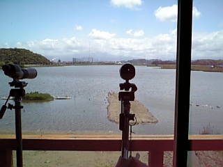 窓際にたくさんの望遠鏡が置いてあり、野鳥の観察ができます。