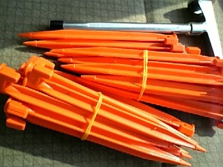 付属品のプラスチック製ペグ24本と金属ハンマーです。